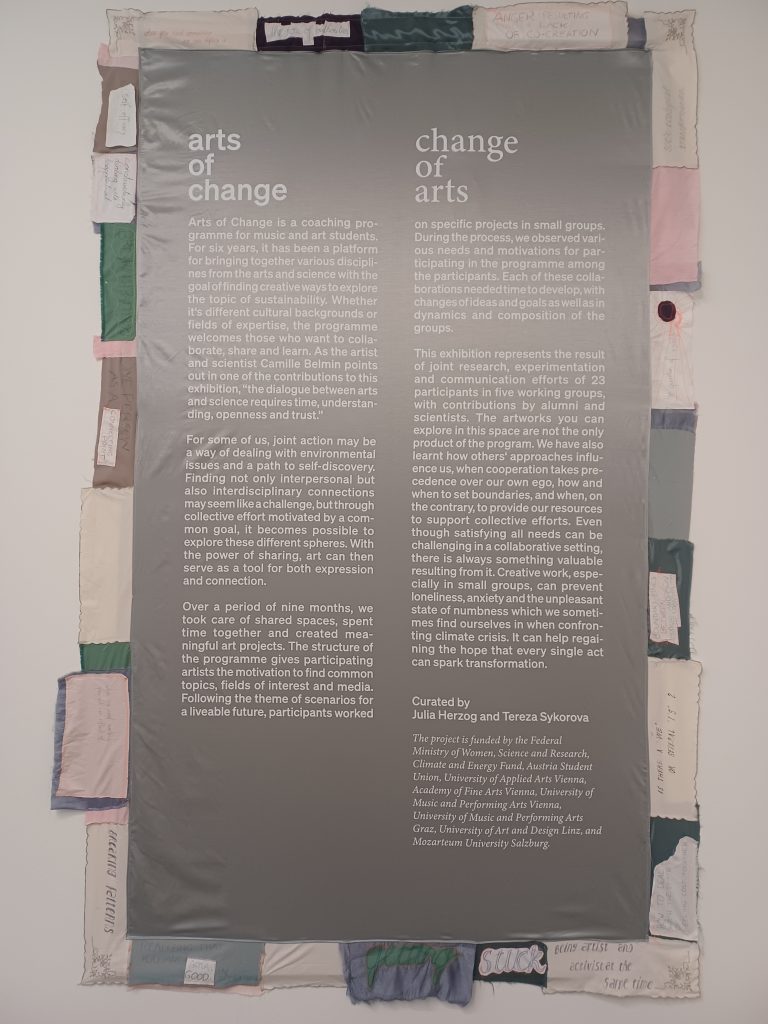 In bewährter Kooperation mit der Koordinationsstelle für Nachhaltigkeit der mdw laden wir zur kostenlosen Führung durch die Abschlussausstellung von Arts of Change 2025 unter dem Titel „Narrative und lebenswerte Zukünfte. Künstlerische Gruppenarbeiten zum Thema Nachhaltigkeit“ im Exhibit Eschenbachegasse, dem Ausstellungsraum der Akademie der bildenden Künste Wien.