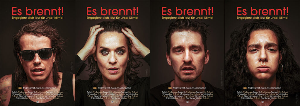 Die Fotoserie „ES BRENNT!“ stellt die Auswirkungen und die Aktualität dieses Themas bildlich dar. Auf den Plakaten sind Prominente, Aktivist:innen und Bürger:innen der Stadt Wien heftig schwitzend zu sehen, denn: Die Klimakrise betrifft alle, egal ob Frau* oder Mann*, alt oder jung, prominent oder nicht.